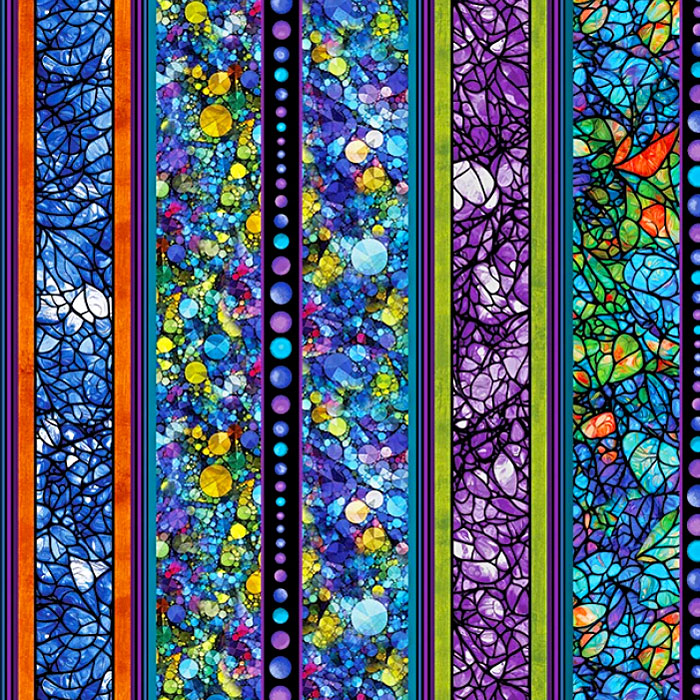 An abstract array of mosaic and stained-glass patterns are layered between the stripes of this energetic design. Wider stripes are about 2" and run the length of the fabric, 'Fractal Stripe Multi' from the 'Cat Artistry' collection by Peggy Collins for Benartex Fabrics.