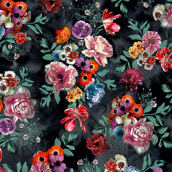 A lush landscape of flourishing flowers coalesce to create a captivating garden gala of texture and tone. Larger flowers are about 3-1/2", from the 'Moon Flower' collection by P&B Textiles.