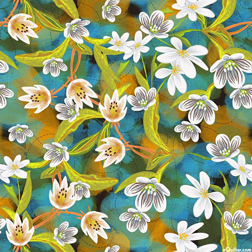 A lush landscape of flourishing flowers coalesce to create a captivating garden gala of texture and tone. Flowers are about 3/4", from the 'Spring in the Northwoods' collection by Jamie Kalvestran for P&B Textiles.
