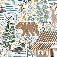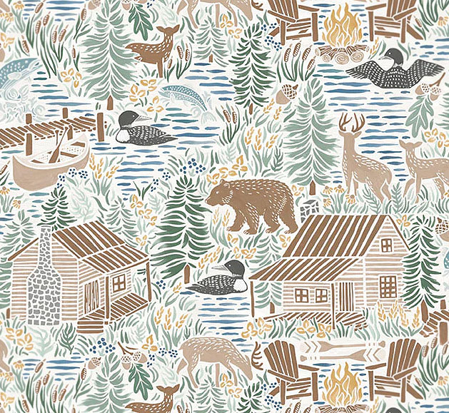 Between campfires and cabins are a wild mix of woodland animals including bears, deer, ducks, and fish. Animals are about 2", from the 'Lakeside Days' collection by Laura Marshall of Wild Apple Graphics for P&B Textiles.