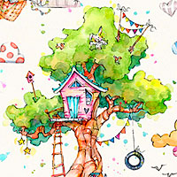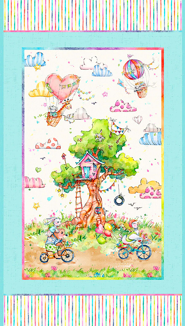 In this panel, a whimsical collection of adorable animals are seen touring the area around a tree house: Elephants riding scooters, giraffes soaring in hot air balloons, porcupines doing tricks on skateboards, geese and rabbits riding bikes, and more! 24" panel, from the 'Whiskerville' collection by Sillier than Sally for P&B Textiles.