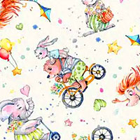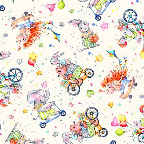 A whimsical collection of adorable animals are seen touring the city by various modes of transportation: Elephants riding scooters, porcupines doing tricks on skateboards, geese and rabbits riding bikes, and more! Bicycle riding animals are about 2", from the 'Whiskerville' collection by Sillier than Sally for P&B Textiles.