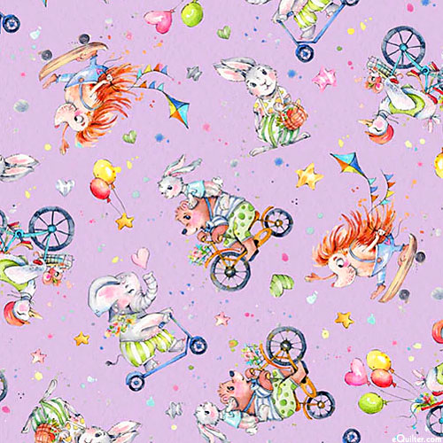 A whimsical collection of adorable animals are seen touring the city by various modes of transportation: Elephants riding scooters, porcupines doing tricks on skateboards, geese and rabbits riding bikes, and more! Bicycle riding animals are about 2", from the 'Whiskerville' collection by Sillier than Sally for P&B Textiles.