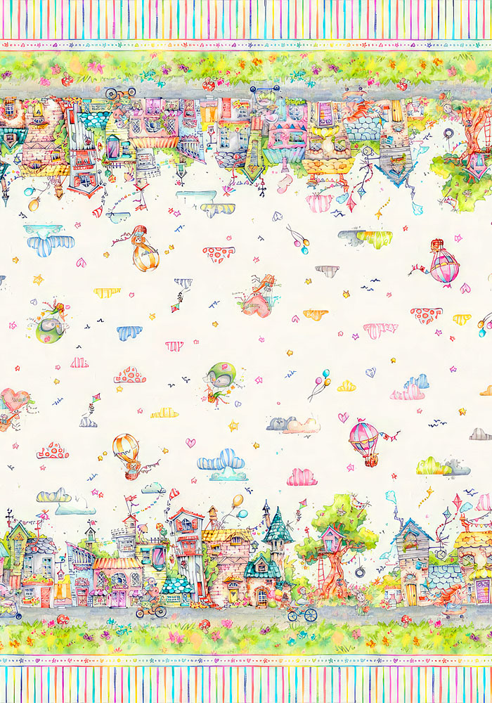 In this double border stripe, a whimsical collection of adorable animals are seen touring the city by various modes of transportation: Elephants riding scooters, giraffes soaring in hot air balloons, porcupines doing tricks on skateboards, geese and rabbits riding bikes. Double border stripe is at both selvedge edges, tree houses are about 5", from the 'Whiskerville' collection by Sillier than Sally for P&B Textiles.
