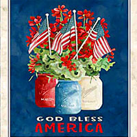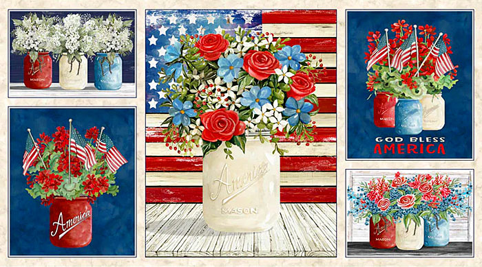Panel blocks contain an elegant assortment of floral bouquets housed in Mason jars, each decorated in American colors and small flags, lending a prideful flair to this patriotic piece. 24" panel, from the 'Farmhouse Americana' collection by Cindy Jacobs for P&B Textiles.