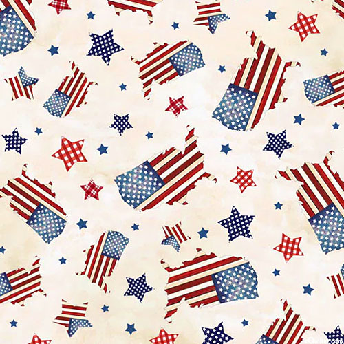 The silhouette of the American map is scattered across the design with small stars spangled in the space between, lending a prideful flair to this patriotic piece. Larger American flags are about 3-1/2, from the 'Farmhouse Americana' collection by Cindy Jacobs for P&B Textiles.
