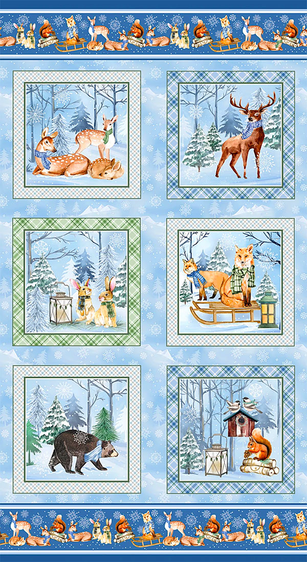 Panel blocks contain imagery of various wild animals living in a snowy forest including reindeer, rabbits, foxes, squirrels, and bears. 24" panel, from the 'Woodland Wonderland' collection by Nicole Decamp for P&B Textiles.