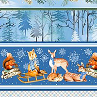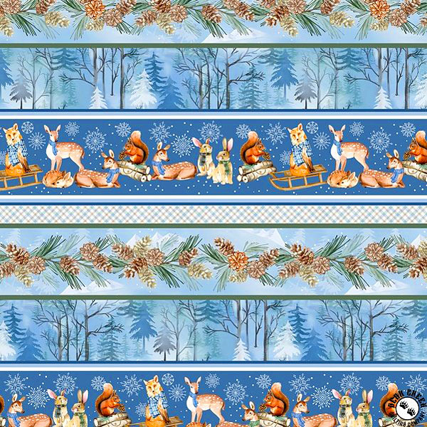 Between the layers of this striped design are several glimpses into the wonders of a wintry woodland including pine cones, snowy trees, and wild animals including deer, squirrels, foxes, and rabbits. Wider stripes are about 3-1/2" and run the length of the fabric, from the 'Woodland Wonderland' collection by Nicole Decamp for P&B Textiles.