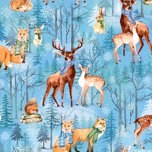 A curious cast of various wild animals living in a snowy forest are depicted across the design including reindeer, rabbits, foxes, and squirrels. Larger animals are about 4-1/2", from the 'Woodland Wonderland' collection by Nicole Decamp for P&B Textiles.