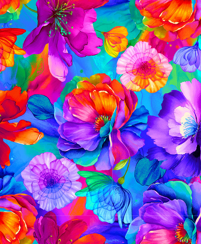 A lush landscape of flourishing flowers coalesce to create a captivating garden gala of texture and tone. Digitally printed, larger flowers are about 4-1/2", 'Rainbow Florals' from the 'Petal Power' collection by Chong-A Hwang for Timeless Treasures.