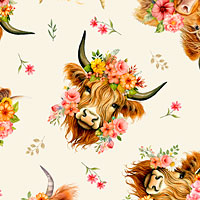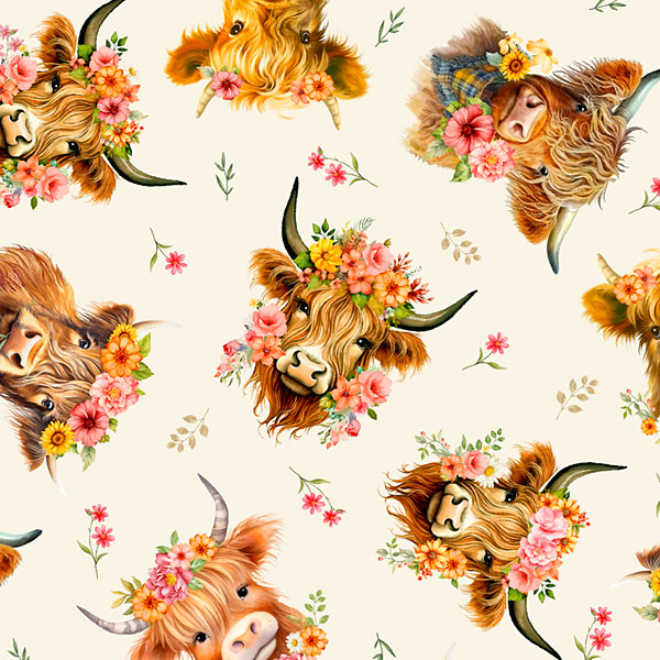 Handsome highland cows decorated in flower crowns are tossed across the design with sprigs and flower buds scattered in the space between. Digitally printed, cows are about 2-1/4", 'Tossed Highland Cows' from the 'You Are My Sunshine' collection by Timeless Treasures.