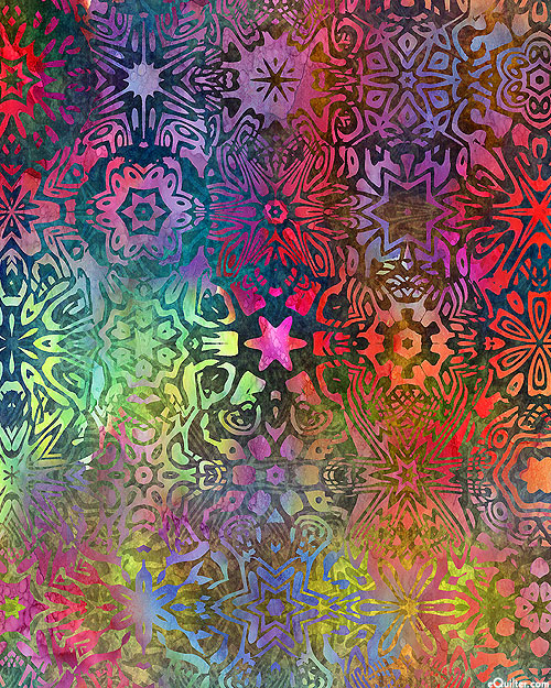A vibrant array of symmetrical patterns resemble the complex designs you might see when looking through a real kaleidoscope, and take on a watercolor texture to increase the unique complexity of the artistic design. Digitally printed, larger medallions are about 4", from the 'Impressions' collection by Jason Yenter for In The Beginning Fabrics.