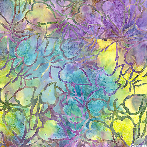Lush leaves flourishing in the forest canopy are depicted in vivid hues within mottled batik textures. Batik, larger leaves are about 2-1/4", 'Packed Leaves' from the 'Tonga Paradise' collection by Wing and A Prayer Design for Timeless Treasures.