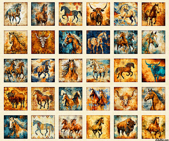 Panel blocks contain a variety of western motifs including wild horses, cow skulls, bulls donning impressive horns, and bison. Digitally printed, 36" panel, panel has thirty frames about 6" x 6", from the 'Born To Run' collection by Dan Morris for Quilting Treasures.