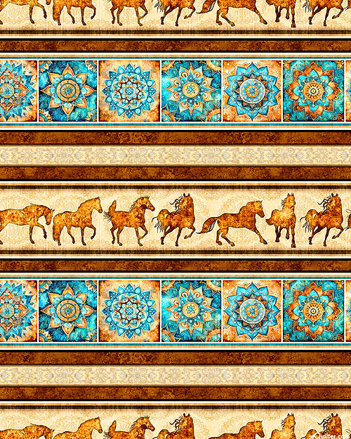 Between the layers of this striped design are elegant medallions that utilize a stunning southwestern color palette, and the silhouettes of wild horses galloping freely across the plains. Digitally printed, wider stripes are about 3", stripes run the length of the fabric, from the 'Born To Run' collection by Dan Morris for Quilting Treasures.