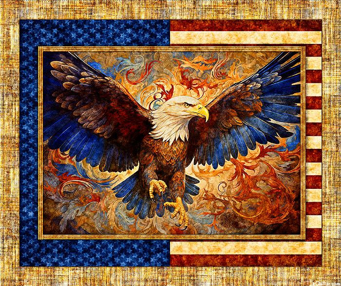Framed by the stars and stripes of the American flag, a brilliant rendition of a bald eagle with wings spread wide is depicted in brilliant hues across this proudly patriotic panel. Digitally printed, 37" panel, from the '1776' collection by Dan Morris for Quilting Treasures.