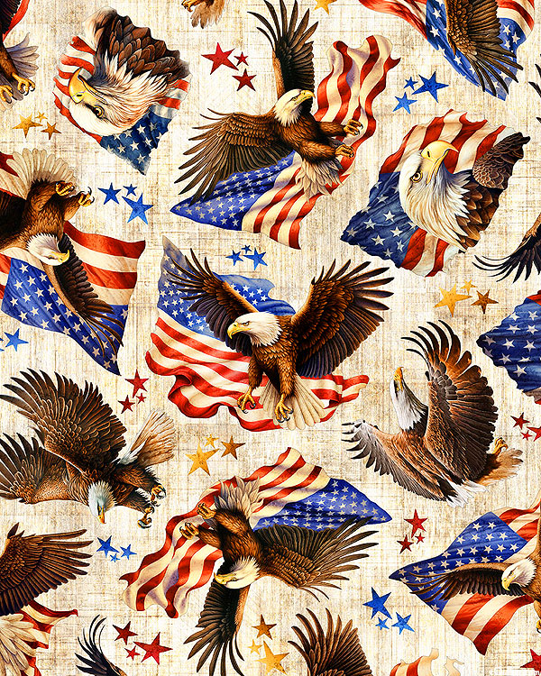 In this patriotic print, bald eagles soar through the air with billowing American flags clutched tightly in their talons. Digitally printed, larger eagles are about 6", from the '1776' collection by Dan Morris for Quilting Treasures.