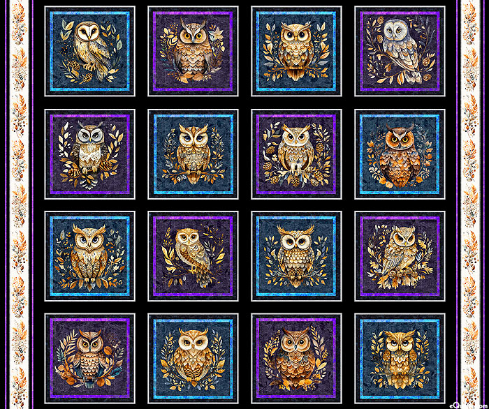 Panel blocks contain imagery of elegantly depicted owls perched on small branches within a lush and leafy garden brimming with life. Digitally printed, 36" panel with sixteen frames about 8" x 8", from the 'Night Owls' collection by Dan Morris for Quilting Treasures.