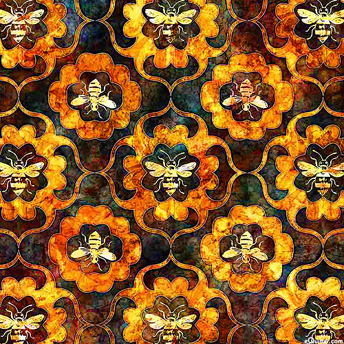 Honeybee medallions are framed within a marvelous mosaic across this charming design. Digitally printed, larger medallions are about 4-1/4", from the 'Queen Bee' collection by Dan Morris for Quilting Treasures.