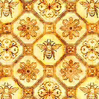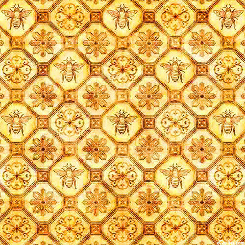 Medallions featuring imagery of honeybees and geometric florals are framed within the tiles of this charming blender. Digitally printed, larger tiles are about 1", from the 'Queen Bee' collection by Dan Morris for Quilting Treasures.