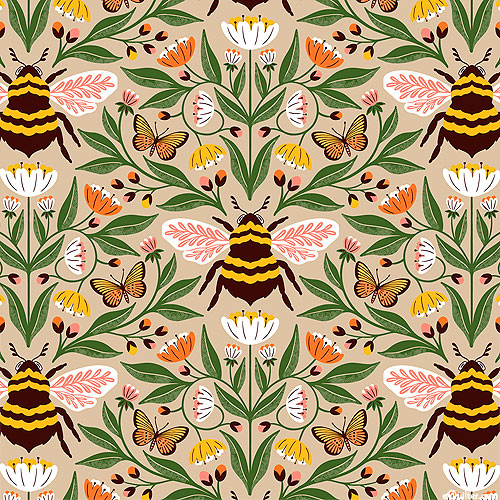 Mirrored patterns featuring honeybees and butterflies are scattered among a lush landscape of verdant garden scenery in this delightful design. 100% GOTS certified organic cotton, larger bees are about 2-1/4", 'Bee-utiful' from the 'Honey Garden' collection by Juliana Tipton for Cloud9 Fabrics.
