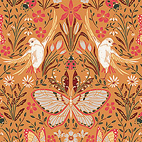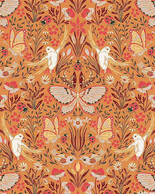 Mirrored patterns featuring birds, butterflies, and ladybugs are scattered among a lush landscape of verdant garden scenery in this delightful design. 100% GOTS certified organic cotton, larger butterflies are about 3-1/2", 'Meadow' from the 'Eventide' collection by Jillian Nichole for Cloud9 Fabrics.