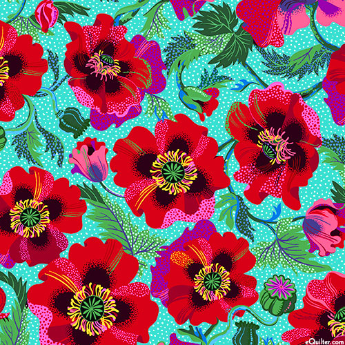 A lush landscape of flourishing flowers coalesce to create a captivating garden gala of texture and tone. Digitally printed, larger flowers are about 3", from the 'Poppy Gala' collection by Lola & Bek for Quilting Treasures.