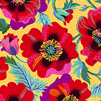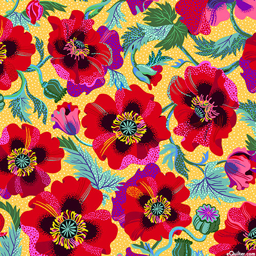 A lush landscape of flourishing flowers coalesce to create a captivating garden gala of texture and tone. Digitally printed, larger flowers are about 3", from the 'Poppy Gala' collection by Lola & Bek for Quilting Treasures.