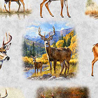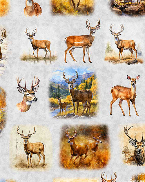 Serene scenes from the wilderness of the woodlands are depicted in cloudy blocks across the design featuring imagery of a herd of deer in their natural habitat. Digitally printed, larger scenes are about 3-1/2", from the 'Buck Wild' collection by Dan Morris for Quilting Treasures.