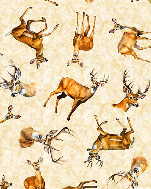 Stags donning impressive antlers are tossed against a mottled background with elegant does scattered in the space between. Digitally printed, larger deer are about 3-1/2", from the 'Buck Wild' collection by Dan Morris for Quilting Treasures.