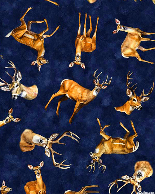 Stags donning impressive antlers are tossed against a mottled background with elegant does scattered in the space between. Digitally printed, larger deer are about 3-1/2", from the 'Buck Wild' collection by Dan Morris for Quilting Treasures.