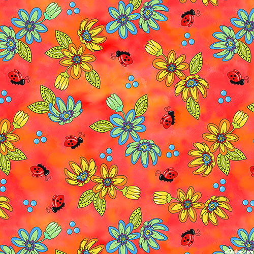 Depicted against a gently mottled background are several tiny ladybugs seen fluttering freely between a lush and leafy garden full of elegant flower blossoms. Digitally printed, larger flowers are about 1", from the 'Whimsical Quilter' collection by Desiree's Designs for Quilting Treasures.