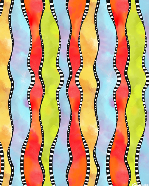 An eye-catching repeating striped pattern of wavy, mottled lines spans the design. Digitally printed, wider stripes are about 1", stripes run the length of the fabric, from the 'Whimsical Quilter' collection by Desiree's Designs for Quilting Treasures.