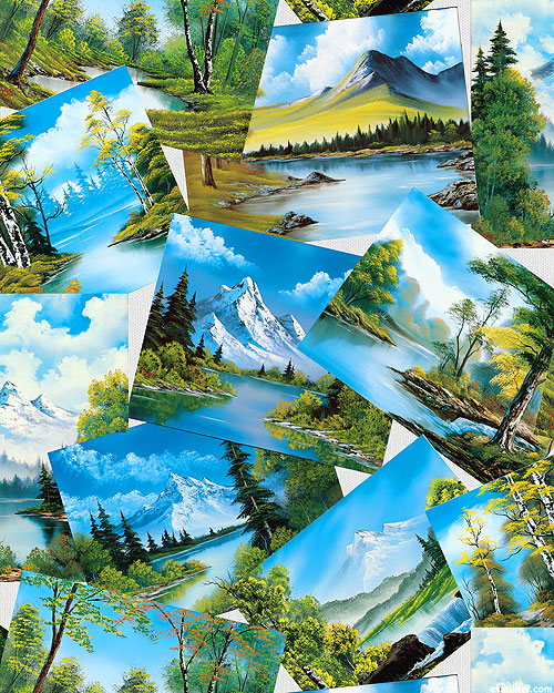 Looking like picture postcards, these landscape canvases by Bob Ross are sure to inspire artistry in your next quilt or sewing project. by Digitally printed, larger frames are about 5-1/4", from the 'The Joy of Painting' collection by Bob Ross for Studio E Fabrics.