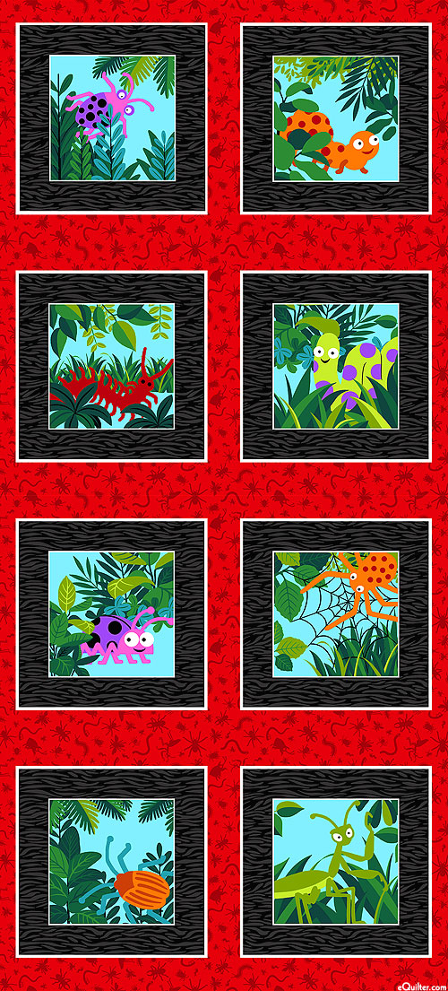 Each frame features a bug in their natural habitat! Beetles explore the forest, Worms look for a tasty leaf, Centipedes and Worms crawl on the forest floor, Ladybugs prepare to fly through the trees and Spiders make the perfect webs. 24" panel, panel has eight frames about 9-1/4" x 9-1/4", from the 'I'm Buggin' Out' collection by Chelsea DesignWorks for Studio E Fabrics. This image has been divided and stacked vertically to display the entire panel.