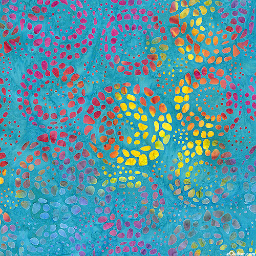 Rocky spirals composed of little pebbles are depicted in vivid hues within mottled batik textures. Batik, larger swirls are about 3", 'Swirl Wood Cut' from the 'Tonga Paradise' collection by Wing and A Prayer Design for Timeless Treasures.