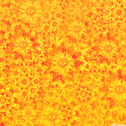 Geometric florals coalesce in a kaleidoscopic cascade of color and shadow across this vibrant design. Digitally printed, larger medallions are about 2-1/2", 'Dancin' Dahlias'. Printed in the USA.