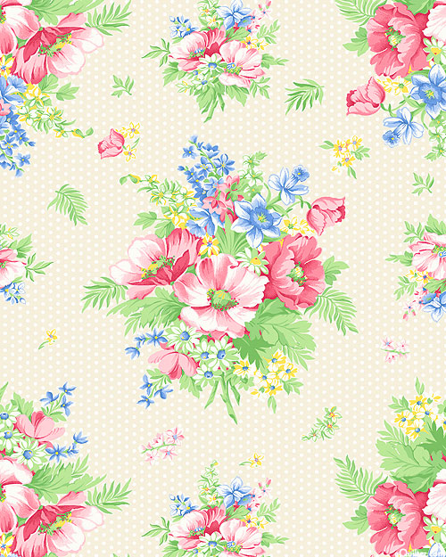 Lush bouquets full of colorful blossoms depicted against a background of polka dots lend a natural charm to this elegant print. Larger bouquets are about 7-1/2", 'Charming' from the 'April's Garden' collection by April Cornell for Benartex Fabrics.