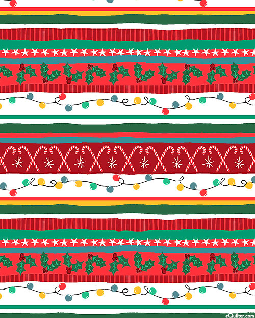 Layered between the stripes of this festive design are a collection of Christmas motifs including Christmas lights, holly, candy canes, and twinkling stars. Wider stripes are about 5/8", stripes run from selvedge to selvedge, 'Holiday Tinsel Stripe' by 3 Wishes Fabric.