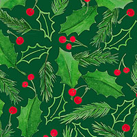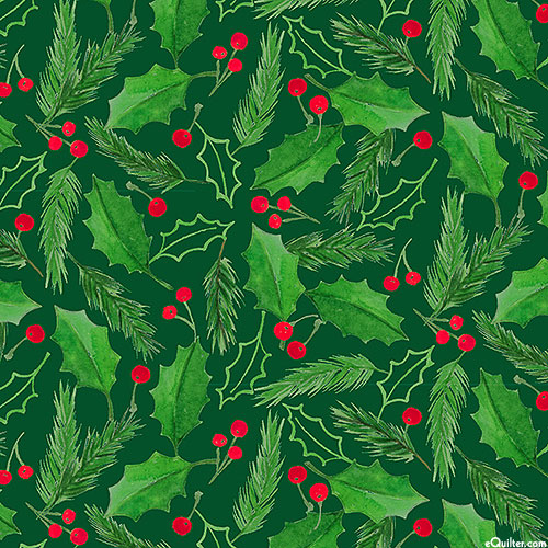 Sprigs of holly laden with ripe berries are scattered across this fun and festive design. Larger leaves are about 1-1/4", 'Holly And Berries' by 3 Wishes Fabric.