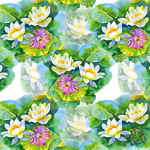 A painterly scene reveals a lush water garden full of lotus florals and lily pads. Digitally printed, larger flowers are about 1-1/2", from the 'Decoupage' collection by In The Beginning Fabrics.
