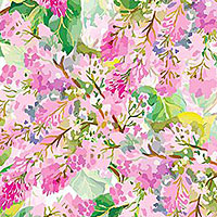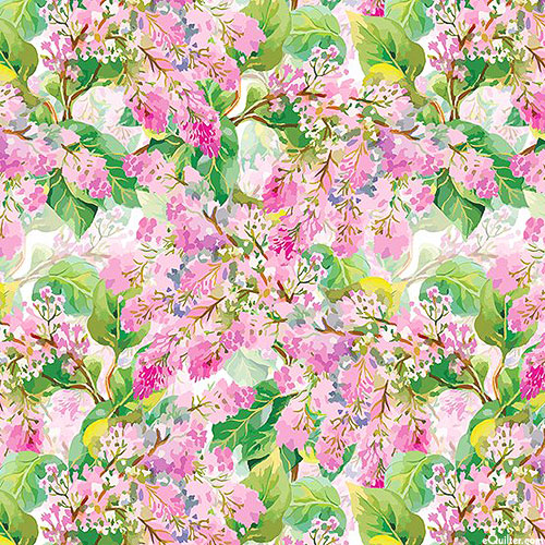 Lush florals blossom on the branches of a tree across this painterly piece. Digitally printed, larger flowers are about 1", from the 'Decoupage' collection by In The Beginning Fabrics.