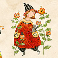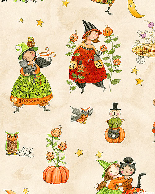 Frolicking together in a haunted grove across this festive design are young witches and their animated friends including pumpkins, gourds, turnips, owls, cats, and the moon itself smiling down from above. Taller figures are about 4-3/4", from the 'Ghoul Friends' collection by Teresa Kogut for Riley Blake Designs.