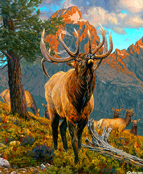 A handsome stag shows off his impressive antlers as his herd of deer grazes on a grassy hillside in this picturesque panel. Digitally printed, 36" panel, from the 'Majestic In Nature' collection by Bruce Miller courtesy of Ansada Licensing for Riley Blake Designs.