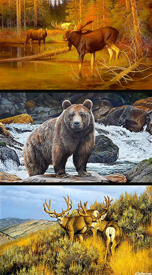 Imagery of various wild animals are depicted in stunning detail across this picturesque panel including moose, bears, and elk. Digitally printed, 24" panel, from the 'Majestic In Nature' collection courtesy of Ansada Licensing for Riley Blake Designs.