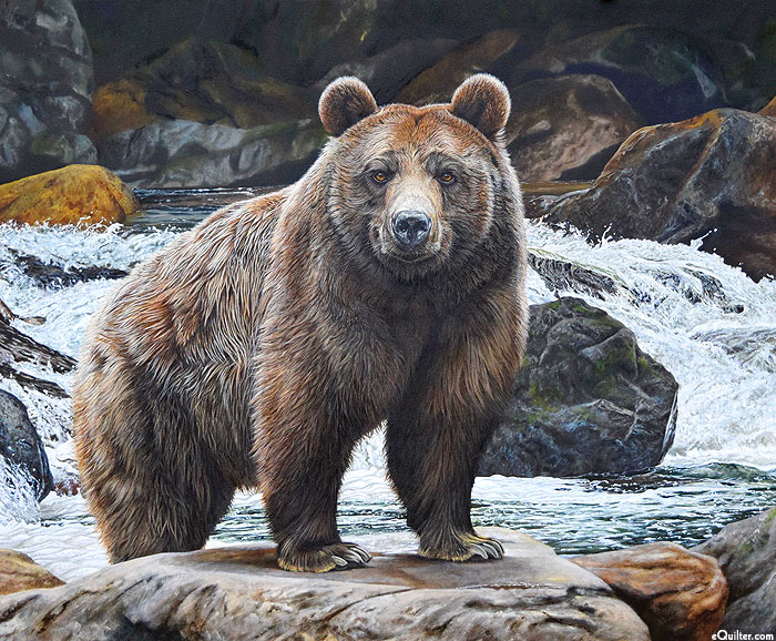 A massive grizzly bear takes the stage of this picturesque panel as it stands on a large river rock in search of its next meal. Digitally printed, 36" panel, from the 'Majestic In Nature' collection by Steve Burgess courtesy of Ansada Licensing for Riley Blake Designs.