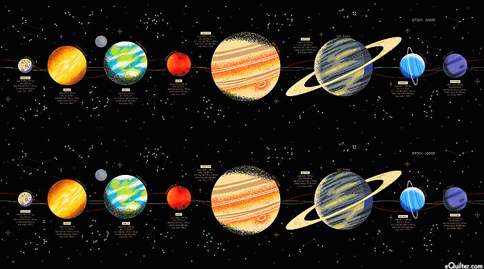The planets of the solar system are displayed across this panel, each labeled with interesting scientific facts, making a perfect design for any lover of astronomy. Digitally printed, 25" panel, from the 'Outer Space' collection by NASA for Riley Blake Designs.