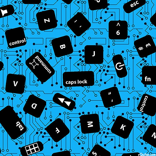 Keyboard keys are strewn over the foreground of this tech-related fabric, as circuit board designs give texture to the background. Larger keyboard keys are about 1", from the 'Data Point' collection by Judy Gauthier for Studio E Fabrics.