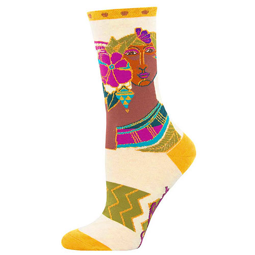 These vibrant socks feature vivid imagery of Laurel Burch's iconic artwork, making a perfect holiday gift for a special someone who wants to keep their feet warm with a fashionable flair! Laurel Burch 'Blossoming Woman - Ivory Heather' socks, 57% Nylon / 39% Cotton / 1% Spandex / 3% Other, women's sock size 9-11, by Socksmith.