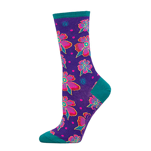 These vibrant socks feature vivid imagery of Laurel Burch's iconic artwork, making a perfect holiday gift for a special someone who wants to keep their feet warm with a fashionable flair! Laurel Burch 'Santa Fe Floral - Purple' socks, 56% Nylon / 39% Cotton / 3% Spandex / 2% Other, women's sock size 9-11, by Socksmith.